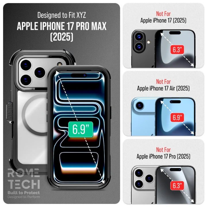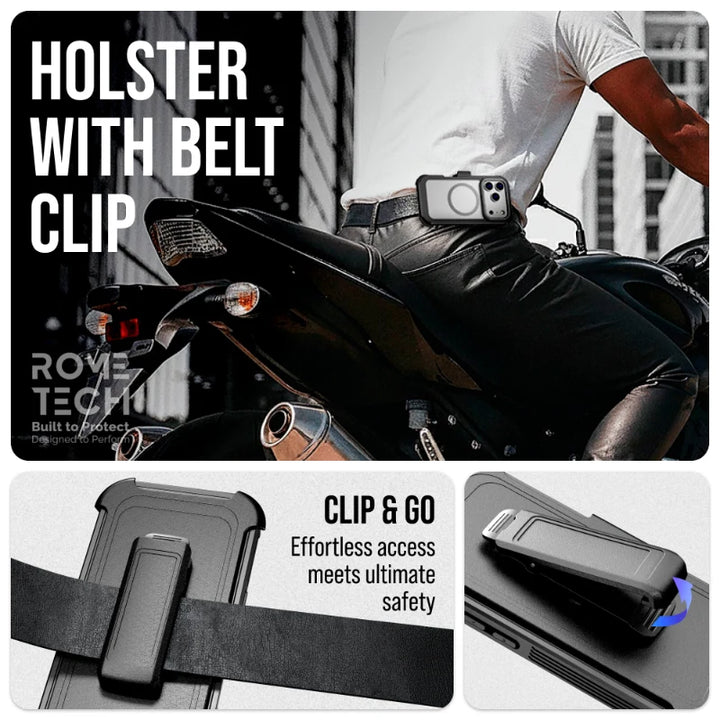 Protective Cases for Apple iPhone 17 Pro Max a is four layers of 360-degree heavy-duty shockproof protection. Our defender case is made out of durable materials with a hard polycarbonate inner shell and soft outer rubber layer. Raised beveled edge keeps your touchscreen safe from scratches. A 360-degree swivel belt clip also functions as a kickstand with different viewing angles perfect for video calls and media playback. Defender case also have easy access to the charging port, buttons, sensors, and camera. Built-in port covers offer protection from dust, dirt, and other elements, making it ideal for commercial use. Rome Tech's Defender case multi-layer design offers rugged drop protection ideal for outdoor adventures, sports, hiking and guards your device against scrapes, bumps, dirt, and dust.