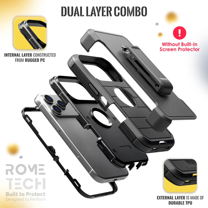 Protective Cases for Apple iPhone 17 Pro Max a is four layers of 360-degree heavy-duty shockproof protection. Our defender series case is made out of durable materials with a hard polycarbonate inner shell and soft outer rubber layer. Raised beveled edge keeps your touchscreen safe from scratches. A 360-degree swivel belt clip also functions as a kickstand with different viewing angles perfect for video calls and media playback. Defender series also have easy access to the charging port, buttons, sensors, and camera. Built-in port covers offer protection from dust, dirt, and other elements, making it ideal for commercial use. Rome Tech's Defender series multi-layer design offers rugged drop protection ideal for outdoor adventures, sports, hiking and guards your device against scrapes, bumps, dirt, and dust.